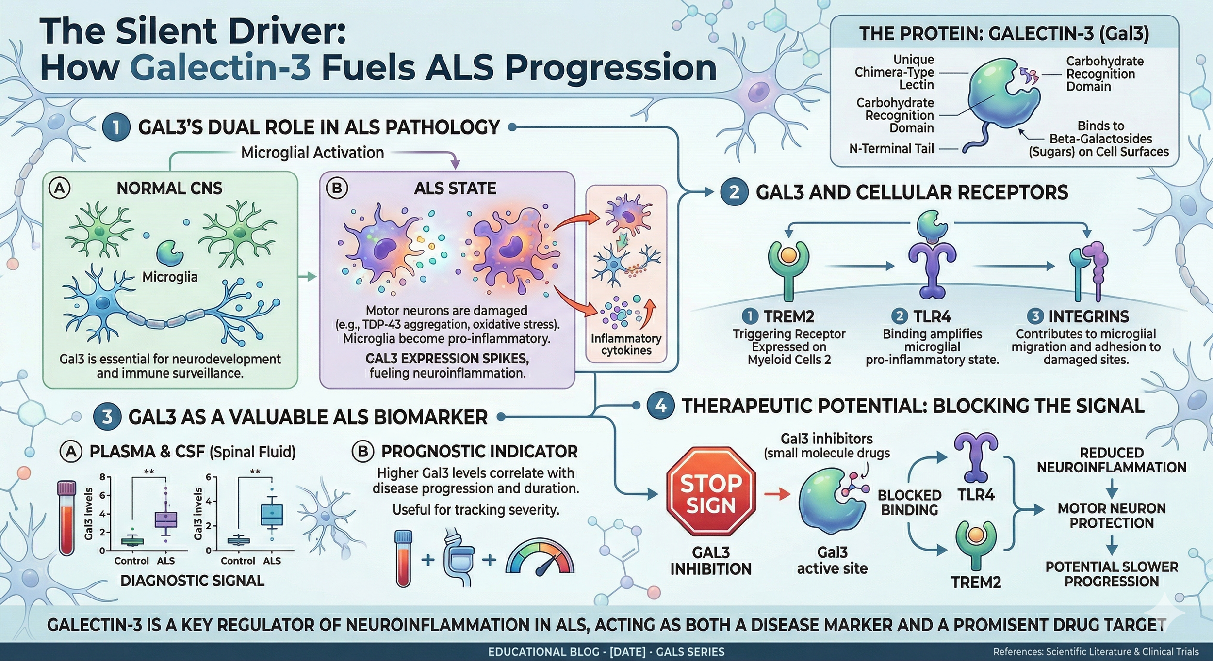 Protein Aggregation: Much like in Alzheimer's, Gal3 may play a role in how toxic proteins (like TDP-43) aggregate and spread throughout the nervous system.