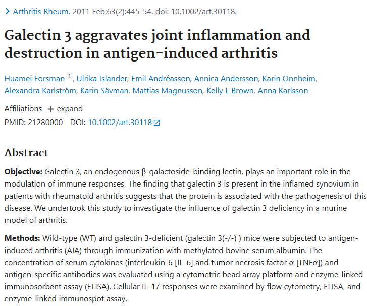 Arthritis is characterized by the breakdown of joint cartilage and inflammation of the synovial membrane (the lining of the joint). Gal3 is found in high concentrations in the synovial fluid of patients with active arthritis, where it serves as a key player in the disease's progression.