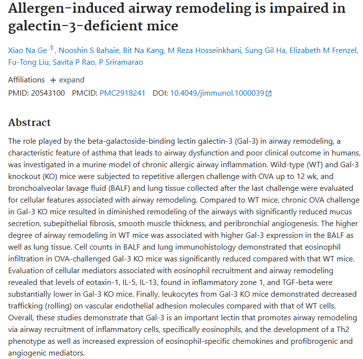 Gal3 Deficiency: Studies in Gal3-null mice show reduced airway hyperresponsiveness (AHR), less eosinophil infiltration, and a reduction of Th2 cytokines (like IL-5).