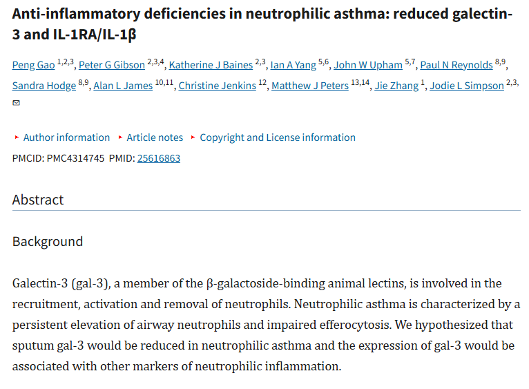 The Biomarker: In humans, significantly reduced levels of Gal3 are detected in the sputum of neutrophilic asthma compared to eosinophilic asthma.