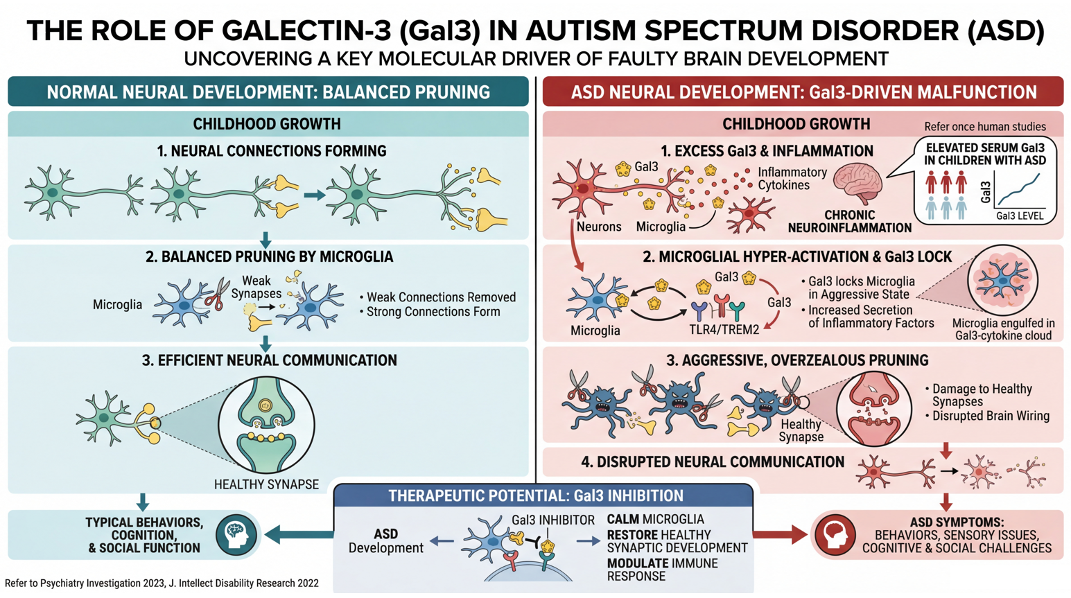 The Gal3 Disruption: In a brain developing with ASD, this delicate gardening process often goes off the rails. Recent research indicates that an overproduction of Gal3 is a primary trigger for this malfunction.