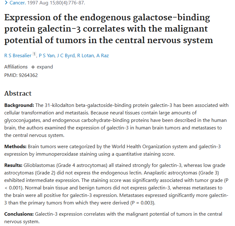 In healthy brain tissue, Gal3 levels are very low. But in Glioblastoma, the tumor cells produce massive amounts of Gal3. In fact, clinical data shows that the higher the Gal3 levels in a patient's brain, the more aggressive the tumor and the poorer the prognosis.