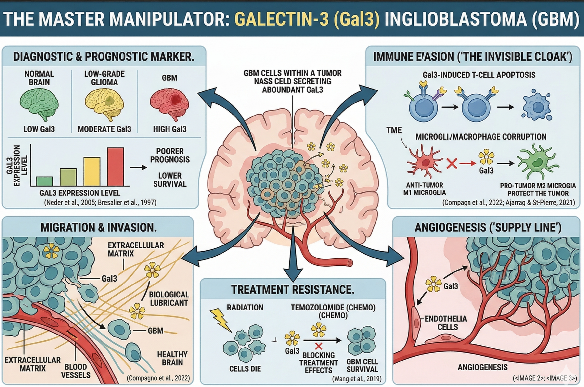 Corrupting Microglia: Just as we see in Alzheimer's and Parkinson's, Gal3 hijacks the brain's resident immune cells (microglia and macrophages). Instead of attacking the tumor, Gal3 forces these immune cells into a "pro-tumor" state, forcing them to build a protective wall around the cancer.