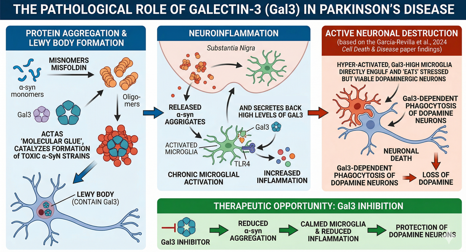 "In Parkinson's, Gal3 acts as both the glue that builds the toxic Lewy bodies and the spark that ignites chronic, neuron-killing brain inflammation."